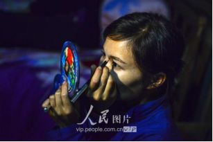 一般要到快過春節(jié)的時候,男方家才專門請人去接女方來洗糯米、打糍粑,新娘方能在夫家住上一夜;在來年農(nóng)忙時節(jié),又接女方來幫忙,夜里仍不能在男方家留宿,幫完忙當(dāng)晚即回去,只有待到女方有身孕后,新娘才到夫家長住。圖為11月16日夜,新娘潘芝銀家為準(zhǔn)備婚禮,燈火徹夜長明。