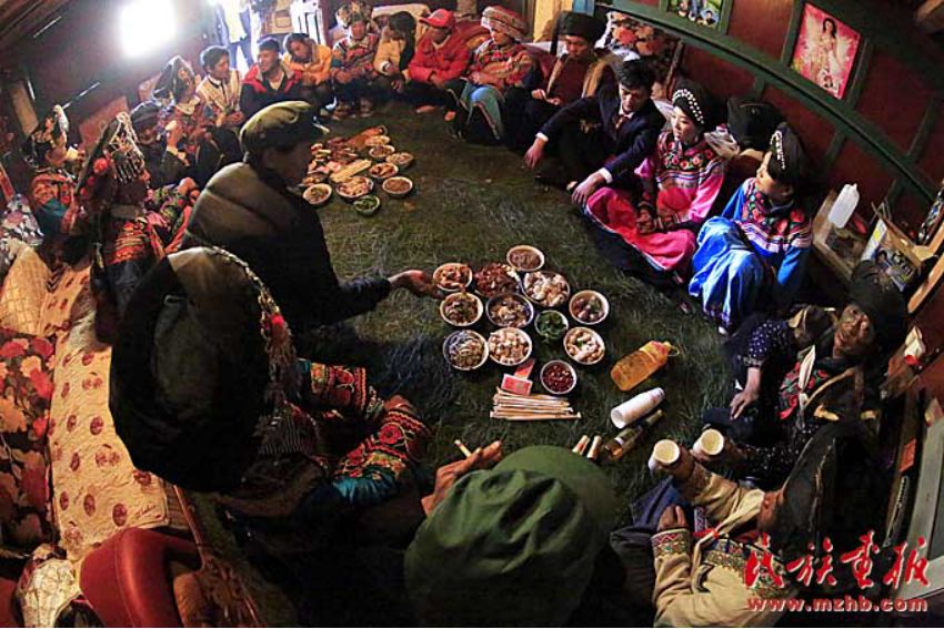 穿長衫,戴著包頭的新郎,把新娘接入正堂屋,將送親的人群迎進(jìn)臨時(shí)搭建的青棚屋休息。青棚,是傈僳族人辦婚事時(shí)砍來毛櫟樹、香樹枝等臨時(shí)搭起的棚子。既清新又涼爽舒適??梢杂脕斫哟e客,也可以作為跳舞、唱曲子的活動(dòng)場(chǎng)所。晚餐就在青棚里進(jìn)行,宴席一般不用桌子,酒菜擺在青棚下面鋪好青松毛的地上,客人八個(gè)一圈,席地坐在青松毛上,圍著喜筵,既歡樂又開心的喝著美酒、品嘗佳肴。晚飯菜肴十分豐盛,足見主人家的好客和廚師的高超手藝。菜出雙不出單,菜的顏色出紅不出白。一切都象征著成雙成對(duì),吉祥如意。