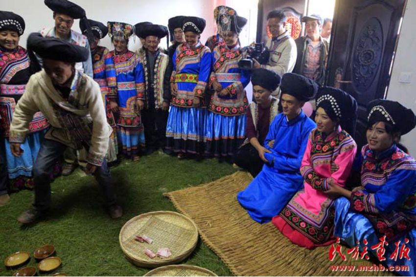 晚飯后,是新郎新娘參拜儀式,在香煙繚繞中,新郎新娘男右女左的并肩站在祖宗堂前,在主婚人洪亮的祈禱聲中,新郎新娘一拜天地,二拜祖宗,三拜父母,而后新郎新娘雙雙對(duì)拜。禮畢,主婚人要給新郎新娘取喜名,傈僳族婚禮中取喜名十分重要,結(jié)婚后只用喜名。取喜名是根據(jù)結(jié)婚時(shí)男方送往女家的彩禮來定的,也有以當(dāng)時(shí)的氣候和其它情況為根據(jù)來定的。宣布喜名后,新郎新娘搶新房,比賽脫婚服,清點(diǎn)禮金和禮物,誰點(diǎn)的多,以后就由誰當(dāng)家。