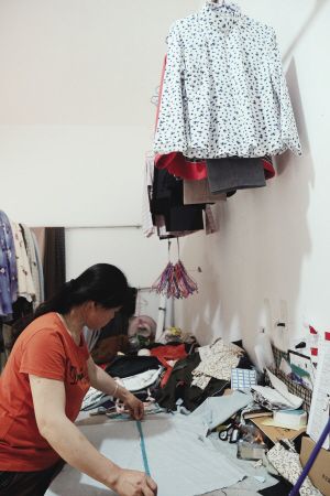 頭頂懸掛著制好的衣服,裁縫阿姐手上開(kāi)始測(cè)量下一件的尺寸。