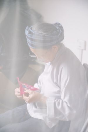 對(duì)制衣人來(lái)說(shuō),她們?nèi)缗e行儀式般專注著染布、成衣,或許也在這個(gè)過(guò)程中積攢起許多專注和深情。一位有十幾年經(jīng)驗(yàn)的阿姐曾告訴我:“做這衣服要有一顆溫柔的心?!甭?tīng)時(shí)深深一顫,而用黃奶奶樸素的話,則是“染布高興”。