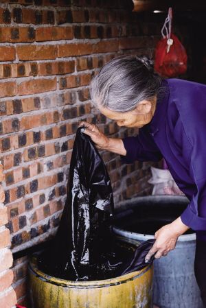 黃奶奶帶我去看她染布的地方,屋頂一間小小的屋子里擺了三個(gè)大缸,還沒(méi)走近就聞到濃烈的藍(lán)靛發(fā)酵所產(chǎn)生的獨(dú)特氣味。染缸用厚厚的布蓋著,如同黃奶奶的秘密寶箱,要掀開(kāi)才能看到里面深色的液體。“今天不成,下次染布給你看?!彼戳丝匆后w表面,也沒(méi)多說(shuō),似乎染缸有它自己的節(jié)奏。