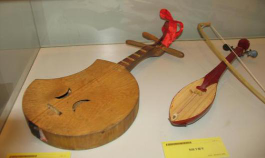 侗琵琶:彈撥樂(lè)器,侗語(yǔ)稱“必巴”,漢語(yǔ)稱“侗琵琶”,有大、中、小三種類型。形狀與三弦相似,用牛角撥片演奏。常用于獨(dú)奏及侗歌伴奏(圖為侗琵琶和牛腿琴)。