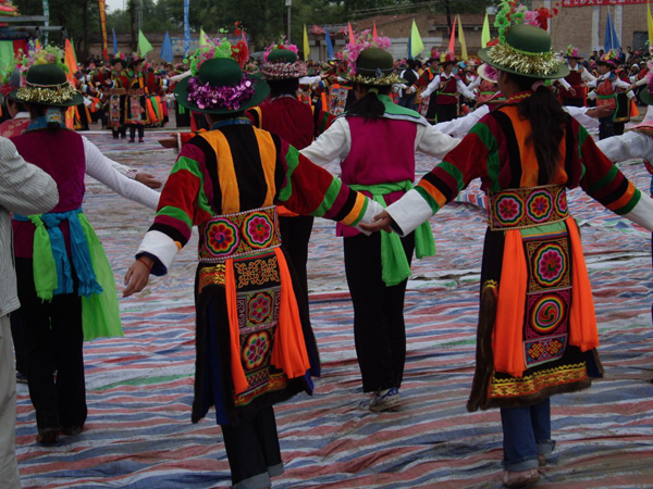 不同地區(qū)的土族舞蹈具有相對(duì)獨(dú)立性,互助的“安昭”、民和的“納頓”、大通的“踏灰”、同仁的“於菟”、甘肅卓尼的“嘎爾”等是最具代表的民間舞蹈?!鞍舱选?,土語(yǔ)稱之為“千佼日”,意為“彎曲”或“轉(zhuǎn)圈”,是土族民間喜慶節(jié)日和婚禮儀式中,用于禮贊祈祝的一種圓場(chǎng)群舞,也是一種歌舞結(jié)合、無(wú)樂器伴奏的集體舞蹈。一般由男女各半圍成圓圈,由一男子帶領(lǐng),一唱眾和。舞蹈動(dòng)作簡(jiǎn)單質(zhì)樸,舞者兩手由右胯旁起向左上方至右上方劃圓弧,變?yōu)樽笫智谀X前,右手高居于后,似雄鷹翱翔于藍(lán)天?!办遁恕蔽杓椿⑽??!办遁恕?,是古代楚人對(duì)虎的方言稱謂。每年農(nóng)歷十一月二十日祭山神時(shí),名為於菟的舞者在赤裸的上身繪制虎豹圖案,模仿虎的形象“前端腿跳”舞蹈,達(dá)到祀神驅(qū)邪、祈求平安的目的。