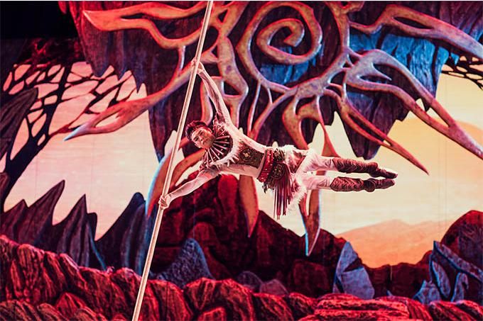 雜技藝術(shù)在劇場(chǎng)空間維度的呈現(xiàn),一是把身體作為一種最為本質(zhì)的符號(hào)材料進(jìn)行直接表現(xiàn);二是通過(guò)與物體、音樂(lè)、舞蹈、燈光、唱詩(shī)等的排列組合,展示技藝的身體與物體、空間的關(guān)系,達(dá)到彰顯其生命意蘊(yùn)與美學(xué)品質(zhì)的目的。劇中網(wǎng)吊、綢吊、轉(zhuǎn)動(dòng)桿上技巧等項(xiàng)目非常炫技,展現(xiàn)了現(xiàn)代雜技的審美意境,詩(shī)與思在舞臺(tái)上相得益彰。綢吊極具浪漫色彩,承載著輪回與終極的生命哲理;智者的“唱詩(shī)”,凸顯了該劇的史詩(shī)特征,增加地域文化和遠(yuǎn)古歷史的厚重感。