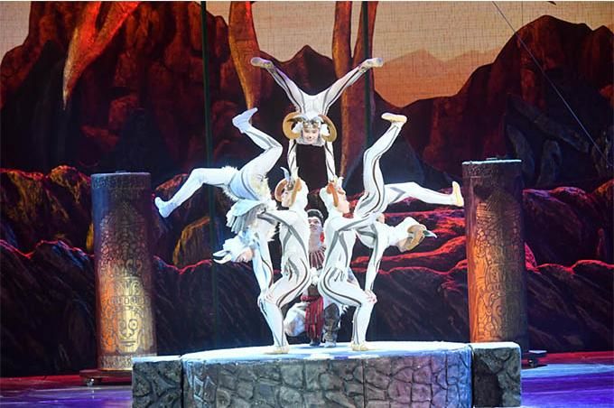 《巖石上的太陽(yáng)》挖掘?qū)幭谋就廖幕夭?,以聞名于世的賀蘭山巖畫(huà)為創(chuàng)作主題,將非物質(zhì)文化遺產(chǎn)用雜技藝術(shù)的形式再現(xiàn)出來(lái),填補(bǔ)了寧夏歷史上大型原創(chuàng)雜技劇的空白。