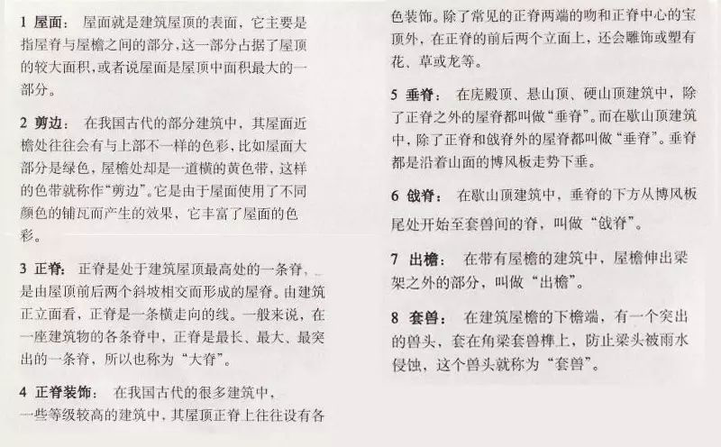 6. 戧脊:在歇山頂建筑中,垂脊的下方從博風(fēng)板尾處開始至套獸間的脊,叫做“戧脊”。