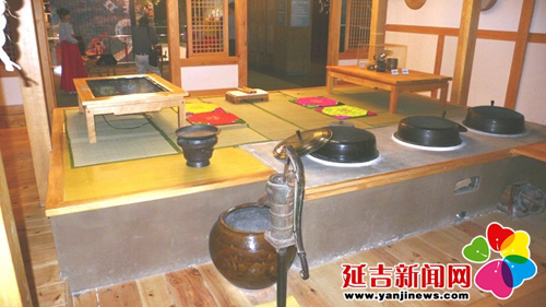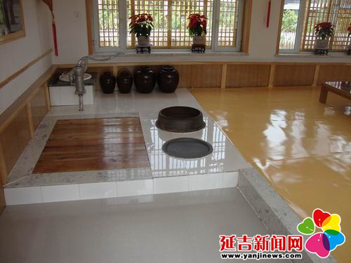 在傳統(tǒng)的朝鮮族民宅中,炕和鍋臺是平齊的,需要燒火做飯時,主婦會打開架在柜臺一側(cè)的移動木板,下到地面水平線以下的“灶坑”點火做飯。傳統(tǒng)的炕采用長筒式結(jié)構(gòu),煙火由一洞內(nèi)循環(huán)排出,使每洞都有煙火串入,炕即溫熱。朝鮮族的火坑高度為30-40厘米,但炕洞向下挖入,炕面抹白灰,表面糊油紙或鋪草簾子,炕面平整。隨著物質(zhì)條件的改善,炕面改鋪纖維板或者地板膠,既美觀又耐用。