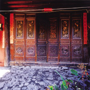 云南大理市綠桃村“三坊一照壁”民居堂屋六扇木門的雕刻。院內(nèi)廈廊和正房的格子門,一般由6扇組成,每扇門又分隔成5塊木板,每塊木板都是透雕和浮雕相結合的木雕。分別雕刻著“雙鳳朝陽、二龍搶寶、八仙過海、喜鵲登梅、漁樵耕讀、六合同春”的吉祥圖案,刀法嫻熟,輪廓清晰,形象生動,一個院落就是一個木雕藝術畫廊。此外,窗上有通透的花格,下部檻墻做成木質裙板。