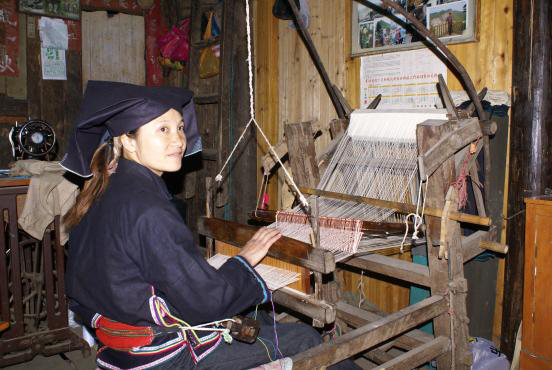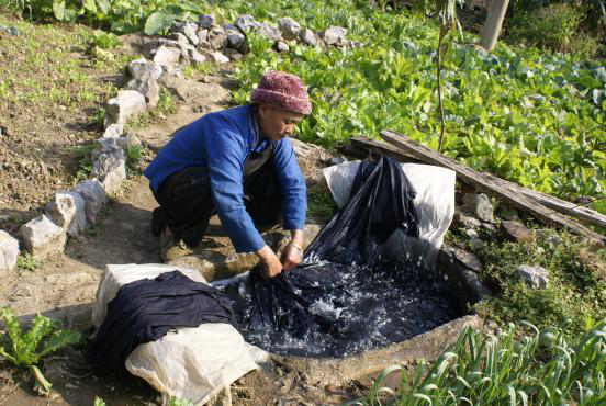 從前壯族鄉(xiāng)村,普遍掌握制作藍靛及印染方法。一般置一大缸,將藍草放入浸泡,加石灰使之分解、發(fā)酵,經(jīng)過化學(xué)變化,而后濾去殘渣,蒸發(fā)水分,凝成糊狀藍色染料。其間需不斷攪動,使色素充分化解?!懊康宀萘俳?,造成一百斤之靛為佳?!币虍a(chǎn)量較多,遠(yuǎn)銷廣東。浸染時,將適量靛糊化于染缸中,同時將雞血藤搗碎加入。布要反復(fù)浸泡多次,晾泡結(jié)合,直到染為深藍色。其間雞血藤釋放出一種紫紅色的植物膠,將藍靛色素粘在纖維上,是色素耐水耐腐耐紫外線,不易褪色,并有若隱若現(xiàn)的亮點,結(jié)實美觀。這個過程,運用了化學(xué)分解法。