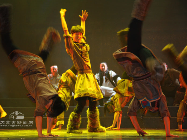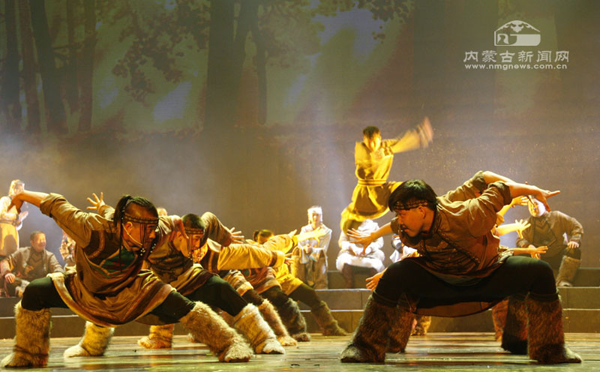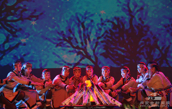 演員們的表演也頗為出色。參演的60多名演員全部來自鄂溫克自治旗烏蘭牧騎,這是一支以年輕人為主的隊伍,他們在舞臺上的精彩表現(xiàn)給這部歷史題材的歌舞劇增添了青春的活力。比如“搶樞”一場,不僅形象地再現(xiàn)了鄂溫克民間一項傳統(tǒng)娛樂活動——“搶樞”,突顯了年輕人活潑好動的特點,而且傳達出鄂溫克年輕人在遷徙途中不畏艱險、苦中作樂的頑強精神。尤其是在本場最后,小伙子們一段奔放狂野的群舞盡顯陽剛之美,展現(xiàn)了鄂溫克民族的豪爽與激情。
