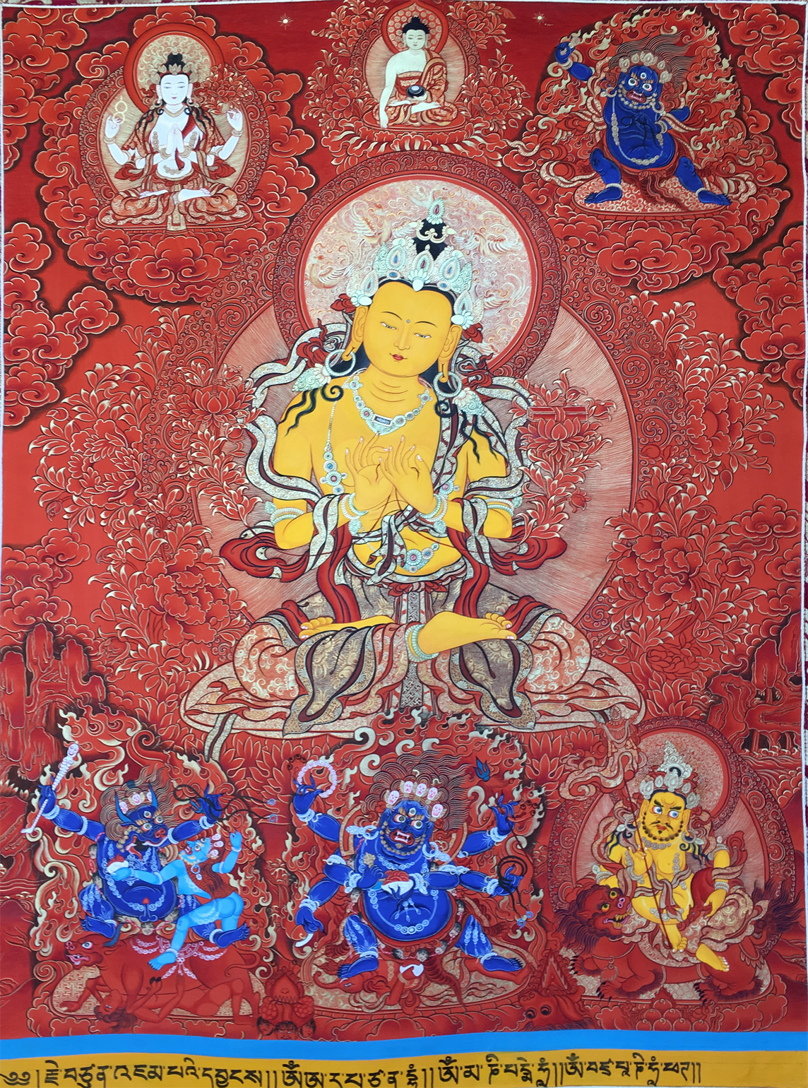 所乘之獅子,象征其威猛。文殊菩薩是如來佛祖怙恃之一。唐卡的原料是以純金、純銀、珊瑚、綠松石作為主要顏料、也可以是諸石朱砂、鉛粉或黃德粉這些普通顏料、正宗的唐卡可以收藏數(shù)百年而不褪色、具有極強的收藏價值。