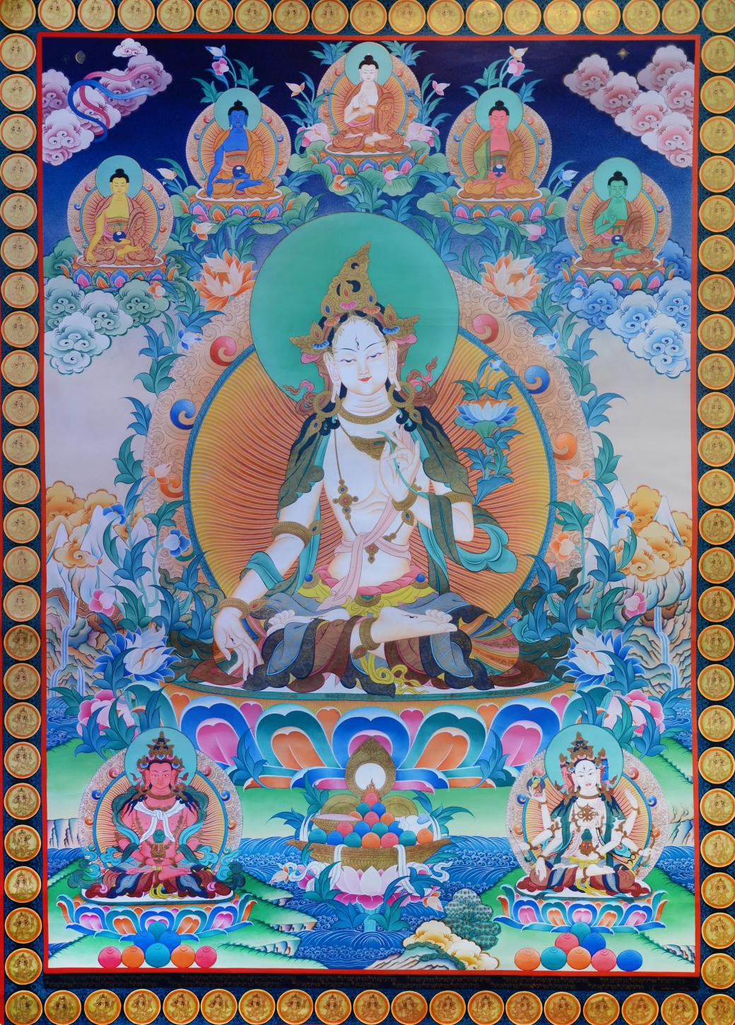 白度母(White Tara),藏音譯卓瑪嘎爾姆,又稱為增壽救度佛母,是觀世音菩薩的化身。觀世音有32種應(yīng)化身,僅其中的度母化身就可以變化為21位救度母,白度母即為圣救度佛母的二十一尊化身之一。在藏傳密教中,綠度母與白度母是二十一尊度母之中流傳最廣的。而藏密又常以長壽佛、白度母及尊勝佛母等三尊合稱為:“長壽三尊”。