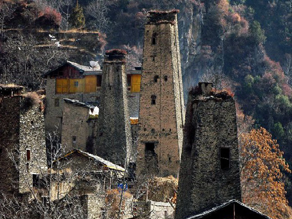 在羌語中,碉樓被稱為“邛籠”,意為美麗、高貴的房子,早在2000年前《后漢書·西南夷傳》就有羌族人“依山居止,壘石為屋,高者至十余丈”的記載。碉樓的高度在十米至三十米之間,用于御敵、貯存糧食和柴草。碉樓有四角、六角、八角幾形式,有的高達(dá)十三四層。建筑材料是石片和黃泥土,墻基深1.35米,以石片砌成。石墻內(nèi)側(cè)與地面垂直,外側(cè)由下而上向內(nèi)稍傾斜。修建時不繪圖、吊線、柱架支撐,全憑高超的技藝與經(jīng)驗。建筑穩(wěn)固牢靠,經(jīng)久不衰。自唐朝來,羌族人民因各種原因向西北遷移,到了西藏和青海,所以現(xiàn)在,羌族碉樓也往往被稱為藏族碉樓。