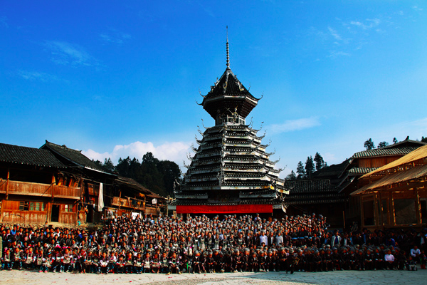 每年的農(nóng)歷八月十五中秋節(jié),小黃都會(huì)舉行賽歌會(huì),有幾十上百人唱歌的壯觀場(chǎng)面,是觀賞侗歌的最佳時(shí)機(jī)。侗族的大歌表演常在鼓樓舉行。侗族的鼓樓、風(fēng)雨橋和大歌是侗族原生文化最突出的標(biāo)志,被稱作“侗寨三寶”。鼓樓是侗族村寨的標(biāo)志性建筑,形似巨大的杉樹(shù),村民稱之為“遮蔭樹(shù)”。在沒(méi)有鼓樓的年代,人們的許多活動(dòng)是在古杉樹(shù)下進(jìn)行的。后來(lái),為了滿足社會(huì)和文化活動(dòng)的需要,修建固定建筑物時(shí)便以杉樹(shù)為原型。文獻(xiàn)資料稱:“侗人居溪峒中,春以巨木埋地作樓,高數(shù)丈,歌者夜則緣宿其上?!边@就是最初的“鼓樓”。