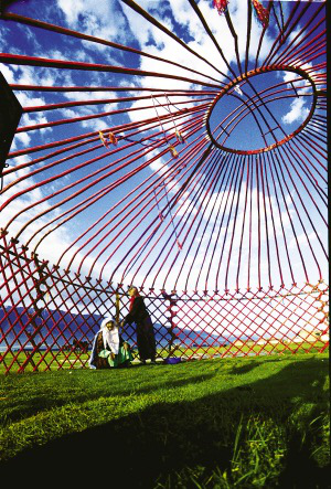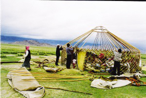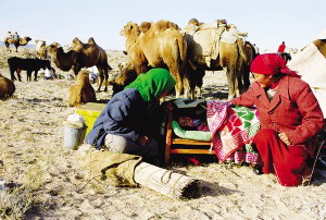 每戶人家的家就在那三四頭駱駝的背上,駱駝的先后排列也是有講究的。一般第一峰駱駝負(fù)責(zé)運(yùn)被褥,婦女和小孩也坐第一峰駱駝。后面的駱駝則運(yùn)衣服、日用品、食物、氈房的羊毛氈和氈房骨架。家里的男人們則騎著馬,趕著大群的牛羊緊跟在后面。平時來往較少的牧民們因?yàn)檗D(zhuǎn)場,有了歡聚的機(jī)會。每天下午,牧民們就開始在路上安營扎寨,男人們開始從駝背上卸下氈房,在路邊搭建臨時簡易氈房;女人們生火煮飯,孩子們成群地奔跑嬉鬧,每家的牧羊狗或打架或形影不離。緩緩的炊煙在金色的黃昏中飄散,男人們開始圍在篝火旁喝酒唱歌,火光映紅每一張黝黑的臉龐,悠遠(yuǎn)的歌聲在空曠的夜空飄蕩。