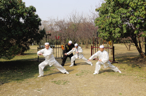 顏勇(中,穿黑衣者)指導(dǎo)回族青年習(xí)練晰揚掌