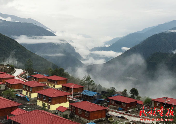 在高山之巔新建起來(lái)的達(dá)木珞巴民族鄉(xiāng)的安居房,是茫茫云海中最鮮艷的一抹紅(央金 攝影)