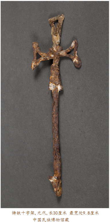 眼前此件在內(nèi)蒙古達(dá)茂旗出土的元代鎏金青銅十字架,四面排列有浮雕金剛杵紋,其正面每個金剛杵圖案上均有鎏金裝飾,十字架上部穿孔則可用于懸掛。金剛杵是藏傳佛教里的修行法器,象征力量與智慧;而十字架則是基督教文化的標(biāo)志,如此混搭,歷史便要傳遞出種種:在信仰藏傳佛教的蒙古高原,金剛杵,象征無畏圓滿,十字架,則代表救贖重生,東西方文化的結(jié)合亦呈現(xiàn)某種文明可能達(dá)到的無可比擬之高度。