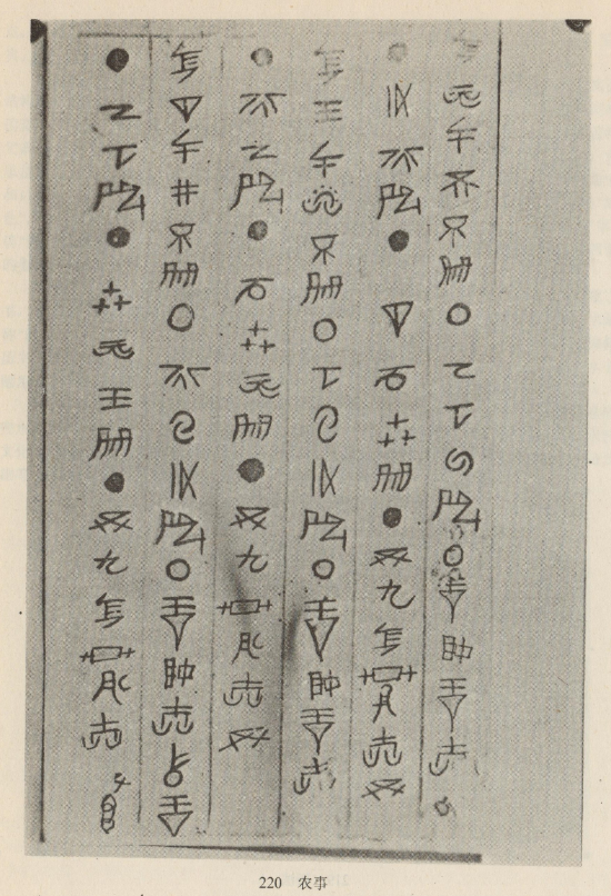 水書抄本。寫于清代,以竹簽作筆書于白皮紙上,共11頁。長26厘米,寬18厘米,從右至左直排。此圖文字乃記述柙棚收獲的時(shí)節(jié),其第1行意為:庚午年丁巳日播種,吉。原件現(xiàn)存北京圖書館。