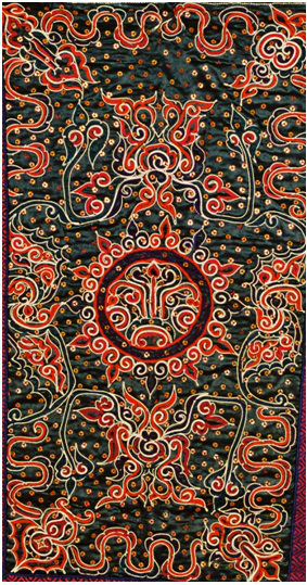 正因馬尾繡的工藝獨(dú)特,蘊(yùn)含著豐富的文化內(nèi)涵,2006年水族馬尾繡入選第一批國家級非物質(zhì)文化遺產(chǎn)名錄。而馬尾繡背兒帶更是將水族馬尾繡的藝術(shù)價(jià)值體現(xiàn)得淋漓盡致。民族文化宮博物館所藏的這件馬尾繡背兒帶,刺繡精美,展現(xiàn)了水族婦女嫻熟的刺繡技藝,是研究水族民俗、民風(fēng)、圖騰崇拜等民族文化的珍貴藝術(shù)資料。