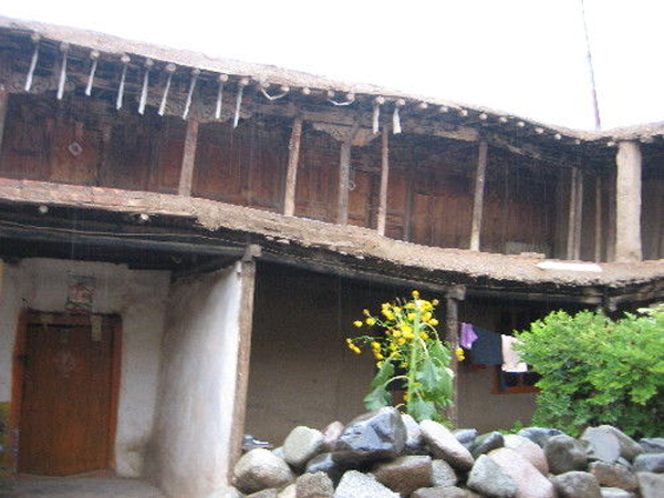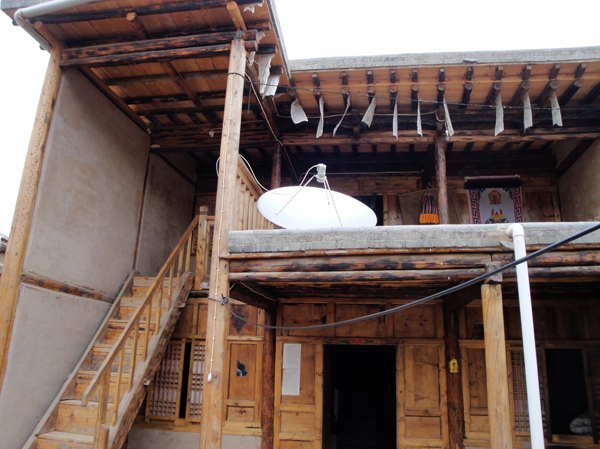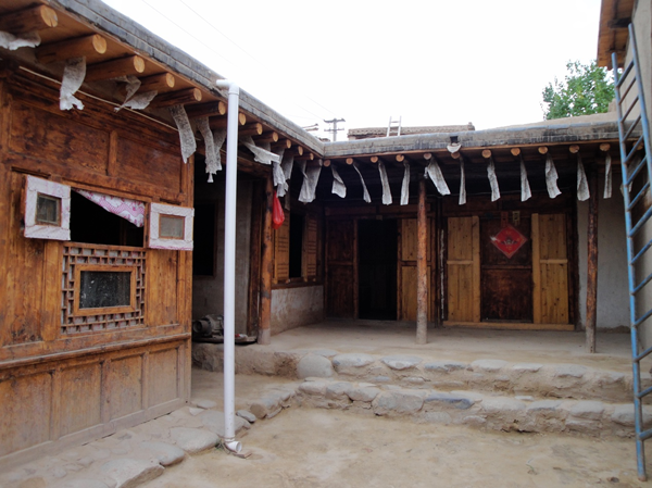 為改善狹小的寨內(nèi)空間,當(dāng)?shù)鼐用窬藿硕幽窘Y(jié)構(gòu)樓房,和青海鄉(xiāng)村民居庭院寬敞的特點形成了反差。寨內(nèi)民居庭院多為四合院式,房屋為土木結(jié)構(gòu)平頂房,一般民居都有飛椽花藻之類。屋內(nèi)一般以木板作隔扇,室內(nèi)有護(hù)炕木板、護(hù)墻木板墻圍,且多雕花草于其上。房屋一般面闊三間,正面以木板隔墻并裝上木板條方格小花窗。佛堂設(shè)在二樓,佛堂所在的房屋一般都是上房,和佛堂不同向的兩邊廂房一般做臥室。院落中央一般都有豎掛經(jīng)幡的旗桿,還設(shè)有桑臺,具有明顯的藏式特點。