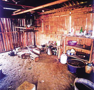 房內(nèi)一般隔成里外兩間,里間狹小,光線暗,是主人的臥室,只放雙人床和一小部分生活用品。外間寬大,是生火煮飯、聚會待客和子女就寢的地方。火塘設(shè)在里間屋的門外,放鐵制三腳架,三腳架對應(yīng)的方位有固定的用途,即靠里間房門一方為主人的座位,靠外間房門一方為客人的座位,火塘上方靠墻處為子女的床位。如有成年子女和新婚夫婦,則在外間再隔出小間,里間和外間存放著生產(chǎn)用具和酒具。房內(nèi)幾乎沒有什么家具和裝飾性的陳設(shè),有的甚至沒有桌椅和床鋪,只在火塘周圍鋪著竹席或木板,合衣向火而眠?;鹛辽厦?米多高處懸掛著竹編的約1米見方的架子,上面放著食具、鹽巴、辣椒等,也是烘烤牛肉干的地方。架子上面靠房頂處并排放著幾個粗大的竹筒,里面存放糧食。這幾年的新村民居,在保持傳統(tǒng)民居特征的前提下使用了新型建材,更堅固,更舒適。