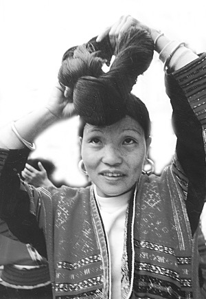我們來到廣西龍勝各族自治縣和平鄉(xiāng)黃洛紅瑤寨時(shí),還沒有進(jìn)寨,就看見三三兩兩的婦女在河水清清的河邊洗頭。她們梳洗著清亮的發(fā)絲,1.6米左右的頭發(fā)又長(zhǎng)又黑,飄飄灑灑。長(zhǎng)發(fā)是紅瑤女的一大特色,紅瑤有世代相傳的蓄發(fā)、護(hù)發(fā)、梳妝發(fā)型的秘方。紅瑤女十二三歲開始蓄發(fā),長(zhǎng)到一定的長(zhǎng)度可以剪下珍藏。等到30歲左右,就可以和秀發(fā)一同盤起。