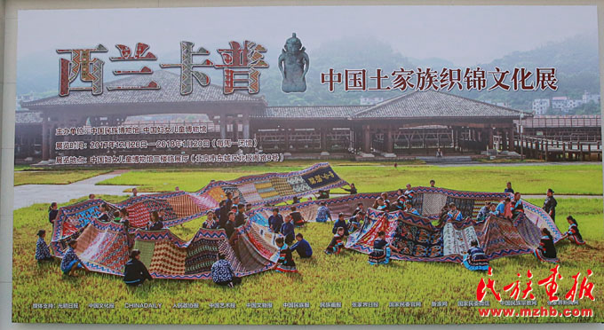 2017年12月20日,“西蘭卡普——中國(guó)土家族織錦文化展”在北京中國(guó)婦女兒童博物館開展。展覽由中國(guó)民族博物館和中國(guó)婦女兒童博物館聯(lián)袂主辦,張家界市人民政府駐京辦事處協(xié)辦。展覽開幕前舉行了土家織錦文化小型座談會(huì),與會(huì)嘉賓從不同角度暢談了土家織錦的藝術(shù)特色。中紀(jì)委駐財(cái)政部紀(jì)檢組原組長(zhǎng)、全國(guó)婦女手工編織協(xié)會(huì)副會(huì)長(zhǎng)賀邦靖,國(guó)家新聞出版廣電總局原黨組成員、副局長(zhǎng)宋昌明,中國(guó)作家協(xié)會(huì)主席團(tuán)委員、中國(guó)少數(shù)民族作家學(xué)會(huì)常務(wù)副會(huì)長(zhǎng)葉梅,張家界市委常委、宣傳部長(zhǎng)郭天保,張家界市副市長(zhǎng)尚生龍,國(guó)家民委國(guó)際交流司原副司長(zhǎng)吳金光,中國(guó)婦女兒童博物館副館長(zhǎng)劉華彬、北京孔廟和國(guó)子監(jiān)博物館館長(zhǎng)吳志友等人參加了座談會(huì)并參觀展覽。