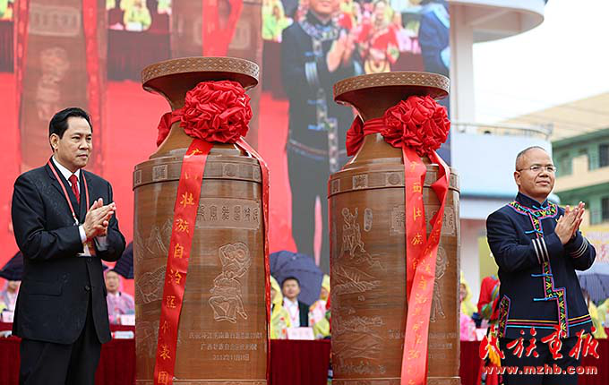 廣西壯族自治區(qū)代表團向環(huán)江縣贈送民族團結(jié)寶瓶(左為廣西壯族自治區(qū)代表團團長,中共廣西壯族自治區(qū)黨委常委、政法委書記黃世勇,右為中共環(huán)江毛南族自治縣委書記黃榮彪)