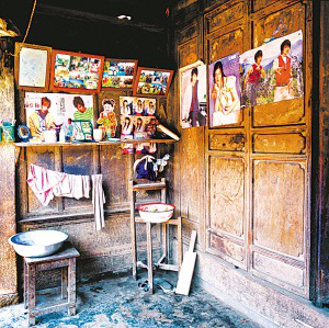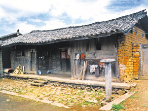 隴川縣戶撒鄉(xiāng)曼旦寨是阿昌族古老的村寨之一,明、清時期的老宅皆以楠木建造,數(shù)百年不朽、無蟲蛀。受漢族文化影響,傳統(tǒng)民居大都是土木石結(jié)構(gòu)的三合一照壁或四合院落。正房建在長方石條加土方壘起的屋基上,屋基下為院壩,以三層石階上下。正房三開間,四排五柱,中柱起脊,形成雙斜面屋頂,上覆凹型青瓦。后墻和兩側(cè)山墻以土坯砌筑,外面不抹泥,左右是廂房或照壁。室內(nèi)隔墻均為木板,中間一間為堂屋,有一米多寬的吞口,六扇雕刻的木板門,平時只開中間兩扇。兩邊的檐柱頭有粗獷的木雕。吞口有走廊的作用,一般左側(cè)角設(shè)臉盆架以供洗漱,板壁上掛小鏡框以便梳妝,旁邊掛著家人的照片。有的擺著縫紉機(jī),有的放藤椅小憩。右側(cè)放臨時的農(nóng)具,掛衣服,板壁上貼著影視明星的招貼畫。堂屋正面板壁是通高的木雕佛龕,供奉佛像和傣文的經(jīng)文,龕楣上貼著三至四層掛錢,下面有燭臺、香爐。左側(cè)擺著電視機(jī)、熱水瓶、茶桌,板壁上掛著戶撒刀和手工編織的背兜,右側(cè)有專供老人休息的床或藤椅,也有的砌火塘,火塘的小土臺上放著炒菜的調(diào)料、火柴和照明燈具。