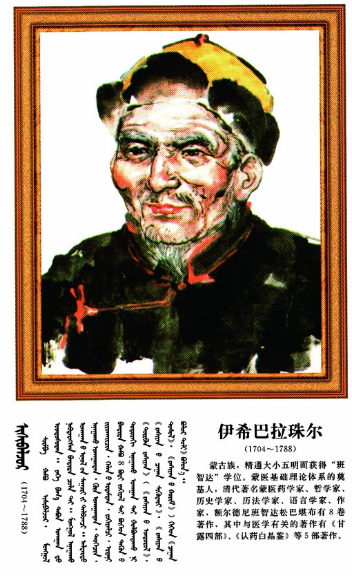 伊希巴拉珠爾(1704~1788),蒙古族,一名也協(xié)班覺、額爾德尼班智達(dá)·松巴堪布,蒙古衛(wèi)拉特人,著名蒙醫(yī)學(xué)家、文學(xué)家、天文學(xué)家哲學(xué)家。一生著作豐厚,其中對(duì)完善蒙醫(yī)理論體系有重要影響的著作有《甘露之泉》、《白露醫(yī)法從新》、《甘露點(diǎn)滴》、《甘露匯集》和《認(rèn)藥水晶鑒》,在這些著作中他將藏醫(yī)學(xué)理論與蒙古人的體質(zhì)、生活習(xí)俗、居住地區(qū)的地理、氣候條件等具體實(shí)際結(jié)合在一起,進(jìn)行創(chuàng)造性的理論研究,不僅豐富了臨床實(shí)踐的內(nèi)容,而且補(bǔ)充和完善了蒙醫(yī)學(xué)的理論體系,他將傳統(tǒng)蒙醫(yī)學(xué)“寒熱理論”與《四部醫(yī)典》中關(guān)于寒熱病理論的闡述進(jìn)行有機(jī)結(jié)合,使之成為近代蒙醫(yī)學(xué)病性辯證的總綱,同時(shí),他也闡述了將六基癥作為病因鑒別診斷的核心及其臨床表現(xiàn),使“六基癥”學(xué)說從理論到實(shí)踐都獲得了比較系統(tǒng)的發(fā)展。占布拉道爾吉是19世紀(jì)著名的蒙藥學(xué)家,他編著的《蒙藥正典》(又名嗚嗚蒙藥圖鑒)共收載蒙醫(yī)臨床常用藥物879種,按礦物、植物和動(dòng)物等分為8部24類,附插圖576幅,對(duì)每種藥物的產(chǎn)地、形態(tài)、性味、功能、入藥部分、采集加工、炮制方法、主治、用法等都闡述詳盡,并且每一味藥物都標(biāo)寫了蒙、藏、滿、漢四種文字的藥名,具有很高的參考價(jià)值。該書還附有外科術(shù)療器具圖解,以及放血穴位、針灸穴位、人體各部分劃分圖解說明等。敏如爾古布拉(1789-1838)編撰了蒙醫(yī)學(xué)方劑巨著《方海》,是一部比較系統(tǒng)完整的蒙醫(yī)藥物方劑學(xué)經(jīng)典著作,收載方劑近200種,分為76章,進(jìn)行詳盡的論述和評(píng)點(diǎn),同時(shí)對(duì)相關(guān)疾病的病因、病機(jī)、分類和治法等也做了簡(jiǎn)要論述。