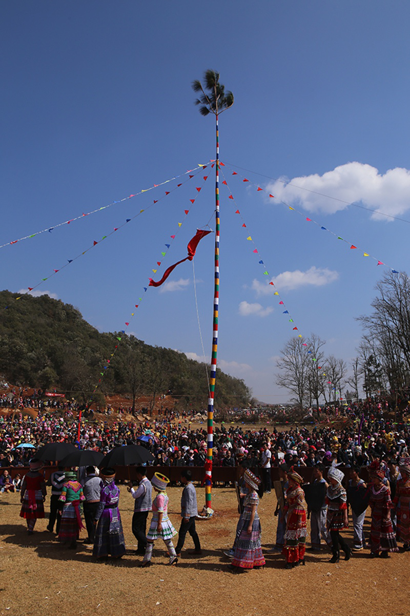 離村子一公里的花山場(chǎng)上,20多米高的公花桿已經(jīng)立在大空?qǐng)鲋虚g,母花桿則立在旁邊的小山頭上,彼此遙相呼應(yīng)。