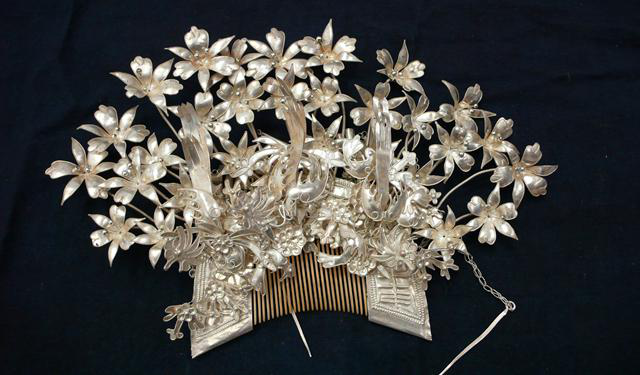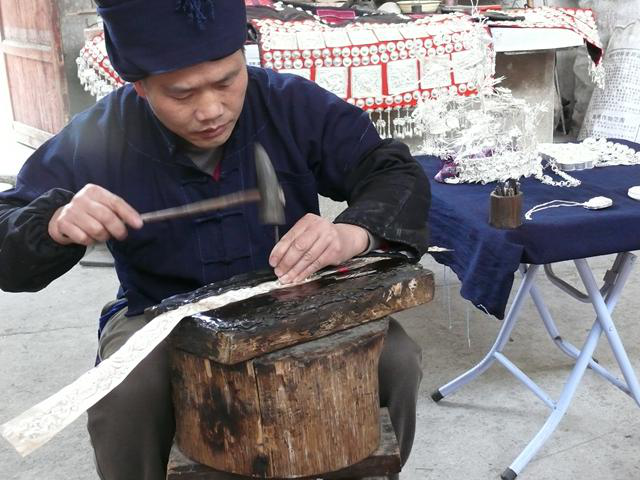 苗族銀飾鍛制技藝歷史悠久,先后經(jīng)歷了從原始裝飾品到巖石貝殼裝飾品、從植物花卉飾品到金銀飾品的演進(jìn)歷程,傳承延續(xù)下來,才有了模式和形態(tài)基本定型的銀飾,其品種式樣至今還在不斷地翻新,由此形成的飾品鏈條成為苗族社會(huì)演進(jìn)的象征之一。貴州省雷山縣、黃平縣、劍河縣、臺(tái)江縣和湖南省鳳凰縣五個(gè)地區(qū)的苗族銀飾鍛制技藝已入選國(guó)家級(jí)非物質(zhì)文化遺產(chǎn)名錄。