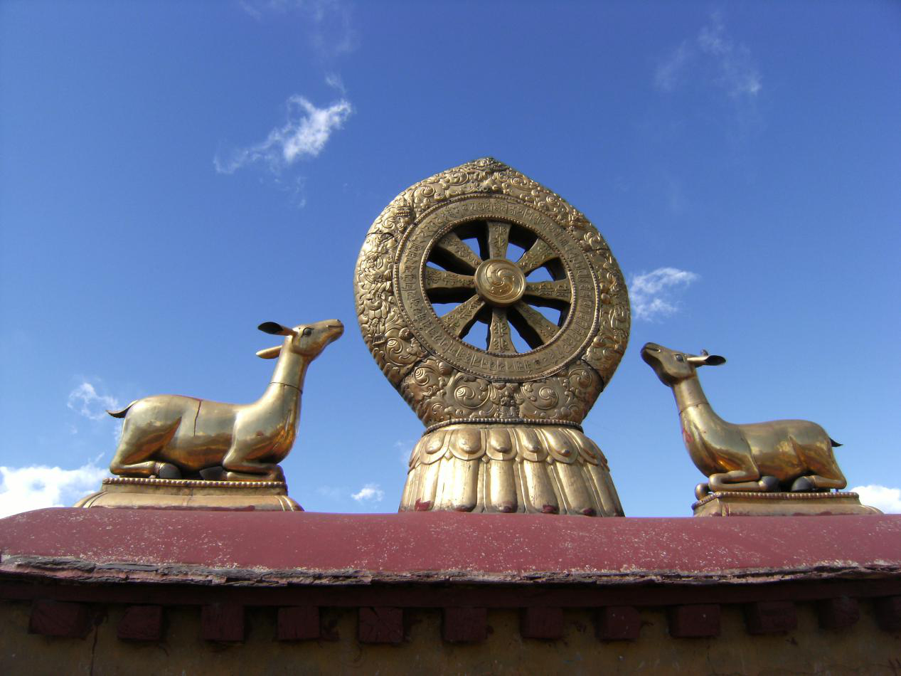 全寺坐東朝西,建筑具唐代風格,有高四層的銅質鎦金樓閣五座、殿堂數(shù)十間。正殿供奉文成公主從長安帶往的釋迦牟尼像,像前擺放十二盞金燈。各殿有松贊干布、文成公主、墀尊公主的塑像及佛像、祖師塑像,還有壁畫眾多。珍藏有七世紀以來的歷代文物。