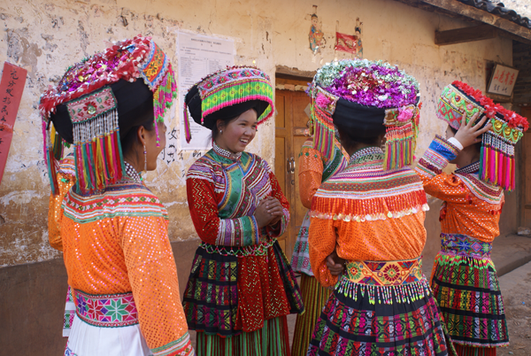 傈僳族服飾分為男女兩種,女子服飾尤為美觀大方,但因地各異,四川德昌、木里等地區(qū)的傈僳族女子用大步纏頭,前垂“劉?!?,穿右衽上衣,上白領(lǐng)巾向下,以紅、黃各色彩線繡出饒身的環(huán)狀花紋,袖上肘部向下繡有繞袖的道道花邊;下著麻布褶裙,腰系彩帶,耳垂環(huán)飾。云南省德宏一帶的傈僳族女子則戴由紅、白、黑步綴滿珠飾的頭帕,下垂銀泡、銀鈴和珠墜;身穿用上百片各色布料精心剪裁、設(shè)計(jì)縫制的連衣裙。在怒江地區(qū),傈僳族女子的服飾也各為其長,平分秋色。如貢山、福貢一帶的傈僳族婦女,一般頭戴由珊瑚珠、海貝殼、料珠串成的“歐勒”帽,身穿右衽收腰的短衫夾襖,短衫一般為淺藍(lán)、淺綠和紅色,夾襖則都是深藍(lán)、深紅、黑等深色,色彩對比十分鮮亮,下著長及腳踝、群折很多的裙子。富裕人家還在胸前掛著由貝殼、料珠、銀幣、瑪瑙串成的胸飾(傈僳語“拉奔”)。而瀘水、蘭坪等地的傈僳族婦女則不穿長裙,不戴頭飾,其服飾為上衣右衽,下著長褲,腰間系一小圍腰,青布或黑布包頭,顯得十分樸素和雅致。