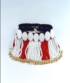 民族文化宮博物館收藏的這件傈僳族綴彩珠女子“歐勒”帽,于上世紀70年代征集于云南省怒江地區(qū)。整個頭飾直徑16厘米、重534克,質地為琉璃質、銅質和海貝。帽身墜有24條紅珠、38條白珠,珠體直徑約0.5厘米,紅白珠串相間分布,每組珠串下墜有金色銅鈴,共29個,環(huán)繞整個帽身排列縫綴16個直徑約3厘米左右的白色海貝片。整個“歐勒”帽色彩鮮艷,制作精美,佩戴起來襯托得傈僳族女子光鮮亮麗、風姿綽約。