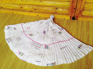 摩梭傳統(tǒng)手工百褶裙 阿七獨支瑪(參展人): 媽媽把許多古老的摩梭圖案編進(jìn)裙布里,并在裙布下方織一條不接頭的紅線,代表生命的輪回,這是摩梭人的一種人生觀。摩梭女性穿的裙子是百褶裙,媽媽編織好圖案及棉布衣后,還要再一個一個地縫上褶線,雖然很花工夫,但制作衣服的時候,是我見過的媽媽最開心的時候。