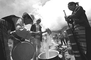 其實(shí),在《舌尖上的中國(guó)1》里,酥油茶就亮相了。攝制組跟拍了到拉薩朝圣的一家人,他們風(fēng)餐露宿,條件艱苦,但只要能起火架爐,燒一鍋滾燙的酥油茶,圍坐在篝火邊美美地喝個(gè)夠,旅途的辛勞似乎就煙消云散了。