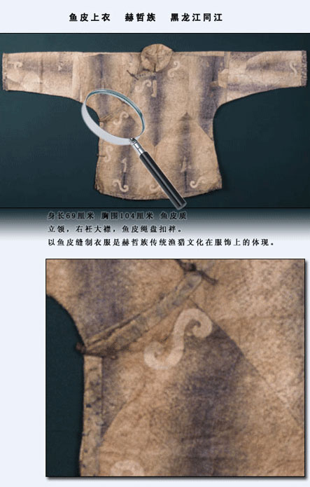 赫哲族的魚皮衣歷史久遠(yuǎn)。我國古代文獻(xiàn)《山海經(jīng)》第九卷《海外東經(jīng)》中便有“玄股之國,在其(黑齒)北,其為人衣魚食鷗” 的記載?!耙卖~”西晉學(xué)者郭璞解釋為“以魚皮為衣也?!闭f明早在兩千多年前,赫哲族的先民就已使用魚皮做衣服了。另據(jù)密山新開流新石器時代遺址中出土的魚叉及骨針,證明赫哲族的先民捕魚和縫制魚皮衣有數(shù)千年歷史了。清代張晉彥的《寧古塔山水記》有:“魚皮部落,食魚為生,不種五谷,以魚皮為衣,暖如牛皮”的記載?!痘是迓氊晥D》記載:“赫哲衣服多用魚皮而緣以色布,邊綴銅鈴,亦與鎧甲相似?!绷硗猓胤街緯鴮Υ艘捕嘤杏涊d。可見,赫哲族制作和穿著魚皮衣是真實而久遠(yuǎn)的。