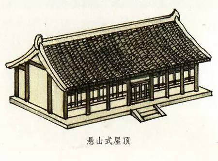 懸山式屋頂與硬山式屋頂一樣有一條正脊和四條垂脊。不過,它又有不同于硬山式屋頂那樣與山墻平齊,而是伸出山墻之外。這部分伸出山墻之外的屋頂是由下面伸出的桁(檁)承托的。所以懸山式屋頂不僅有前后出檐,在兩側(cè)山墻上也有出檐。懸山式是兩面坡屋頂?shù)脑缙谧龇ǎ贿^中國古代的重要建筑基本沒有使用懸山式屋頂?shù)模貏e是唐代以前尤為少見。