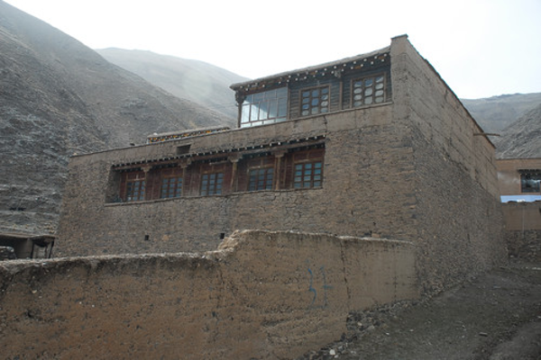 “碉院”則是一組較大的綜合性建筑,一般三層,局部四層,平面為四全院式,中間有較大的天井內(nèi)院,設(shè)小花壇,可種樹木花卉。內(nèi)院四周設(shè)回廊,石砌外墻用全封閉,除了門洞,墻上開少量小窗。底層為牲畜圈、雜用房;二層多為倉庫、接待房、傭工房等;三層為臥室、廚房和糧倉、珍寶庫;四層為經(jīng)堂、佛堂、經(jīng)書庫。有的在外墻女兒墻部分刷以黑色或棕色圓珠圖案,窗上檐一層或二層方椽挑出,作為傳統(tǒng)式藏窗形式,豐富了立面,改變了石墻面之笨拙感。