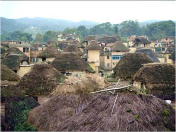 哈尼族一個核心的家庭的一幢完整的磨菇房,包括正房、左右?guī)?、庭院和圍墻等?shù)個建筑單元,家中配有腳碓、石磨、水缸、織機(jī)、藍(lán)靛染缸、犁、耙、刀、斧、鋤、籮和火塘等生產(chǎn)生活設(shè)施,滿足作為社會生產(chǎn)和生活單位的家庭的諸多需求。若干家庭的磨菇房逐次排列,就逐漸變成了一個哈尼族山寨的磨菇房群落。