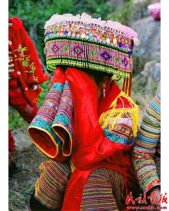 刮臉回來后,張正秀就由姐妹陪伴在閨房。屋外送親的酒席在熱鬧中開席時,舅母就回到閨房里為她洗臉洗腳,改換嫁衣。按傳統(tǒng)習(xí)俗,要把新娘用過的水潑灑在閨房的地上,以示吉利。新娘穿上由親人縫制的繡花衣裙,從頭到腳煥然一新。穿戴整齊后,新娘由伴娘陪同坐在閨房門旁的草地上接受祝福。女方家請的懂禮儀的阿巴莫(司儀)手持菜花和松針葉在堂屋敬女方家神,告訴家神姑娘要出嫁了,并給前一天夜里來新娘家領(lǐng)親的兩位娃拿扒(證婚人)挎上兩條交叉打結(jié)的紅布,表示娃拿扒已承諾為女方家領(lǐng)親。