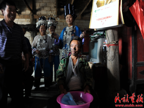 姑娘出嫁必須有娘家人陪送,婚禮這一天清早,“新娘”便在“接親客”的帶領(lǐng)和送親隊(duì)伍的陪同下,一路歡聲笑語(yǔ) ,浩浩蕩蕩向“新郎”家走來(lái)。走到新郎家村邊,有的燃放鞭炮,一直燃放到新郎家門口,請(qǐng)新郎父母出來(lái)開(kāi)門;無(wú)鞭炮準(zhǔn)備的,則在寨邊稍候,由迎親伙伴飛報(bào)新郎家做好迎親的準(zhǔn)備。男方父母聽(tīng)到后,多數(shù)是很高興地喊醒家中兒女,由新郎的妹妹或堂姐妹為迎親主體,加上寨上的姐妹和房族組成迎親隊(duì)伍,打開(kāi)大門,把新娘迎進(jìn)家來(lái)。接親的主要儀式是接傘。接傘的人必須是新郎的小妹或堂妹。無(wú)親妹、堂妹者則由新郎父母指定一與新郎同輩份的小姑娘去接。新娘走至大門,即由新郎的妹妹跨出門外迎接新嫂子,新嫂子接著用左手把雨傘遞給接傘的妹妹,接傘妹妹接過(guò)新嫂子手中的雨傘后,新娘即用左腳跨進(jìn)屋內(nèi),以示今后成為新家庭的主婦。隨即由接傘妹妹攜新娘手迎入新房,迎親婦女們陸續(xù)進(jìn)入新房休息。入門后,新郎家的“陪娘”及姑娘們便熱情地安排“送親客”團(tuán)團(tuán)圍坐,并簇?fù)碇靶履铩本o靠堂屋中柱子就坐,意為“新娘”從此當(dāng)家立業(yè),將來(lái)就像中柱子一樣,頂大梁,撐起這個(gè)家。