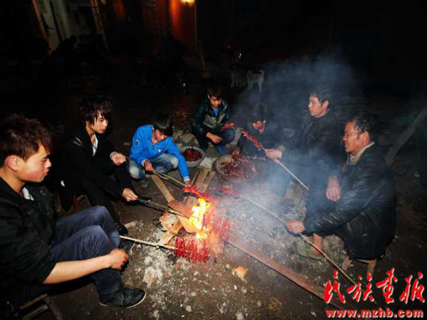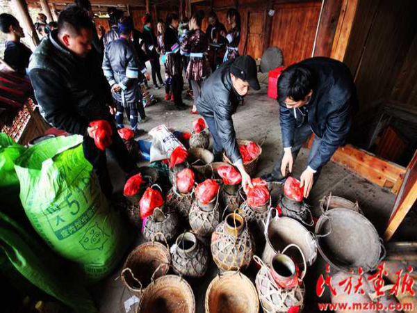 這次結(jié)婚的共有15對新人(多時有二三十對),均來自本寨的青年男女?;槎Y從大年二十六開始,共進(jìn)行三天,在三天的婚禮中新郎新娘家均有婚宴,尤以第一天中午的規(guī)模最大也最為隆重。