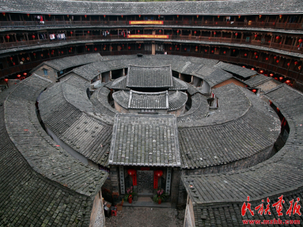 位于永定縣高頭鄉(xiāng)的客家土樓承啟樓建成于清代康熙年間,因?yàn)閯庸r間都艷陽高照、天公作美,所以又被稱為“天助樓”。同時,承啟樓是福建現(xiàn)存的最高大、古老的圓樓,也是文化內(nèi)涵最豐富的一座土樓,所以又被稱為“土樓王”。