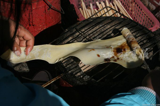 街邊小攤上的烤乳扇,風味別具一格,烤的時候要涂抹玫瑰糖