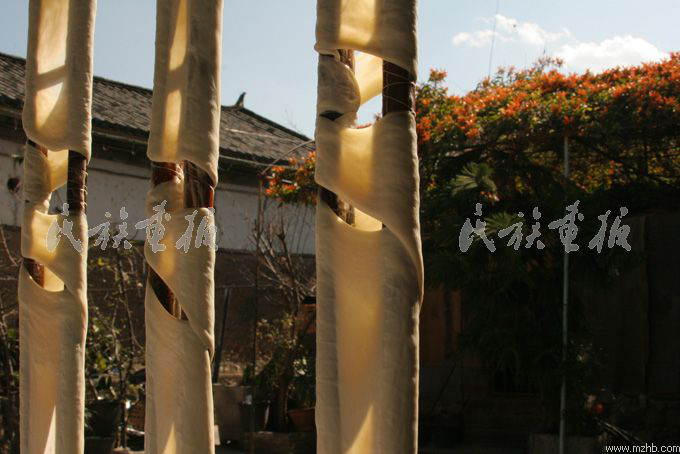 冬日里的一個午后,我來到蝴蝶泉邊的周城村,在一戶白族人家里探訪了乳扇的制作過程。剛到大門口,就聞到一股淡 淡的乳香。走進院子,只見一位白族婦女正舉著一根長長的桿子往老高老高的鐵絲上掛,院子里掛滿了一排排白花花的像是裹著白布的竹桿。走近一看,桿子上白白的東西并不是白布,向導告訴我,這就是乳扇。