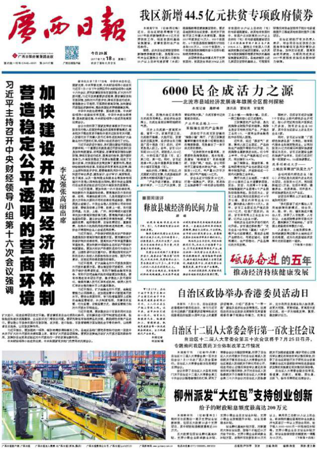 《廣西日?qǐng)?bào)》立足廣西、面向全國(guó),國(guó)內(nèi)外公開發(fā)行。目前,星期一至星期五每日出版對(duì)開12版,星期六、星期日出版對(duì)開8版,彩色印刷,是廣西第一大綜合性日?qǐng)?bào)。新聞信息容量大,專刊副刊多樣,適應(yīng)多層次讀者需要,集指導(dǎo)性、權(quán)威性、科學(xué)性、服務(wù)性、實(shí)用性、知識(shí)性和趣味性為一體。